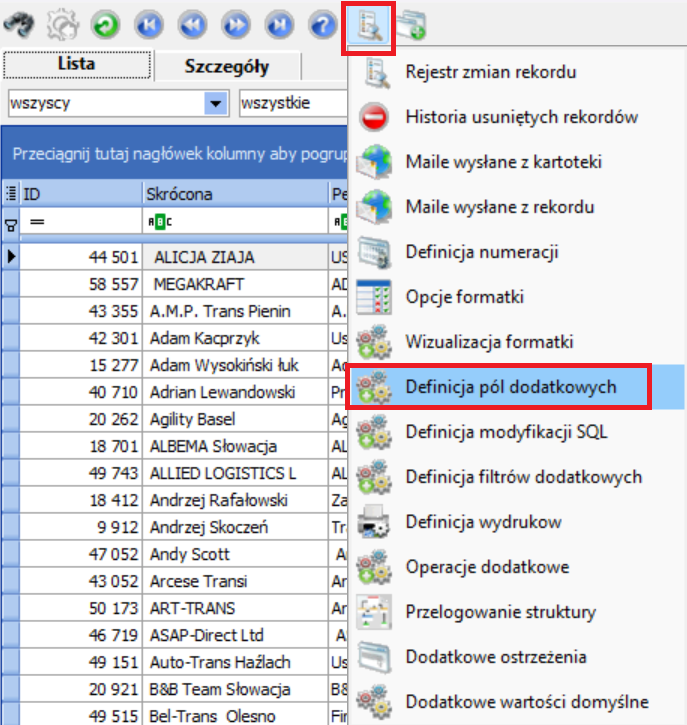 Następnie z ikon w lewym górnym rogu wybieramy drugą ikonę od prawej, a z rozwiniętej listy wybieramy „Definicja pól dodatkowych”