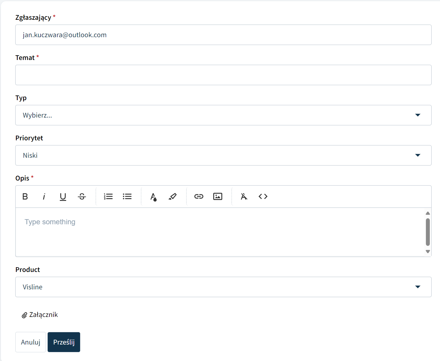 - Następnie uzupełniamy informacje dotyczące zgłoszenia Temat Typ Priorytet oraz Opis: