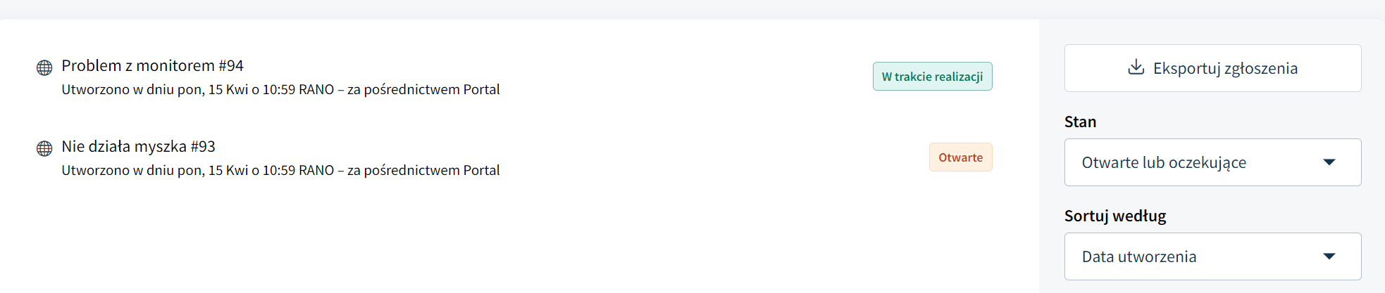 2. Z tego miejsca posiadasz dostęp do wszystkich swoich zgłoszeń. Możesz je dowolnie filtrować względem statusu, sortować, a także eksportować do pliku csv lub excel.